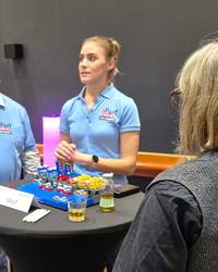Das Highlight unserer Präsenz war der mobile Montagearbeitsplatz mit einem kollaborativen Roboter (Cobot). Der Demonstrator nutzt Mensch-Roboter-Kollaboration (MRK) und künstliche Intelligenz (KI), um Menschen in Produktionsumgebungen zu unterstützen und Montageprozesse zu optimieren. Unsere Besucherinnen und Besucher konnten hautnah erleben, wie intelligente Automatisierung mit geringen Investitionen umsetzbar ist.